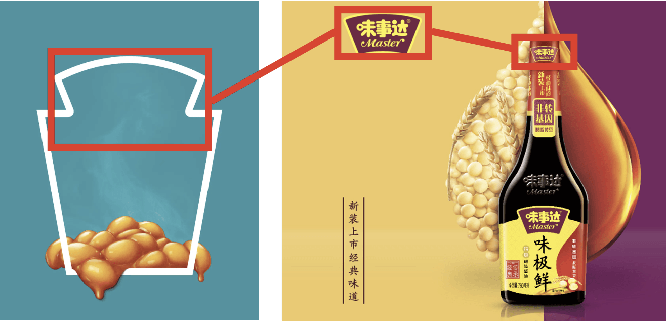 Examining the packaging for the Master soy sauce, note that the keystone is reduced to just the top arch, as I have indicated in the adjacent images. Subsequently, along with the label written in Chinese you wouldn’t know it was a Heinz product. However, the advert is on brand with its use of images depicting fresh and healthy ingredients, along with the adverts striking colours. Look again and you notice more gold has been used on the advertising and packaging in the Heinz range, which like in western society symbolises wealth and riches in Chinese culture too. So, the idea could be to make the Heinz products look more prestigious amongst other brands.