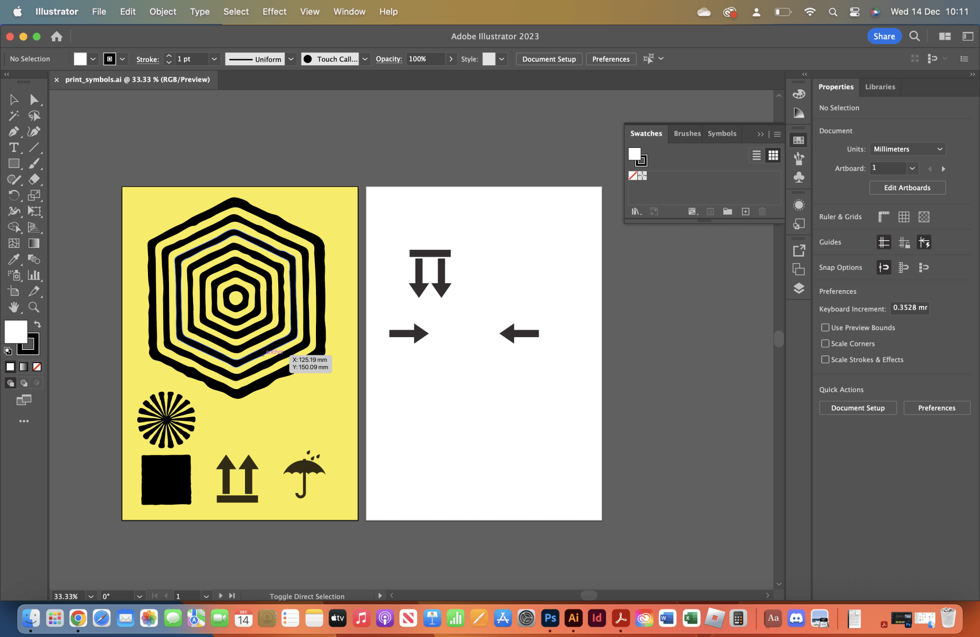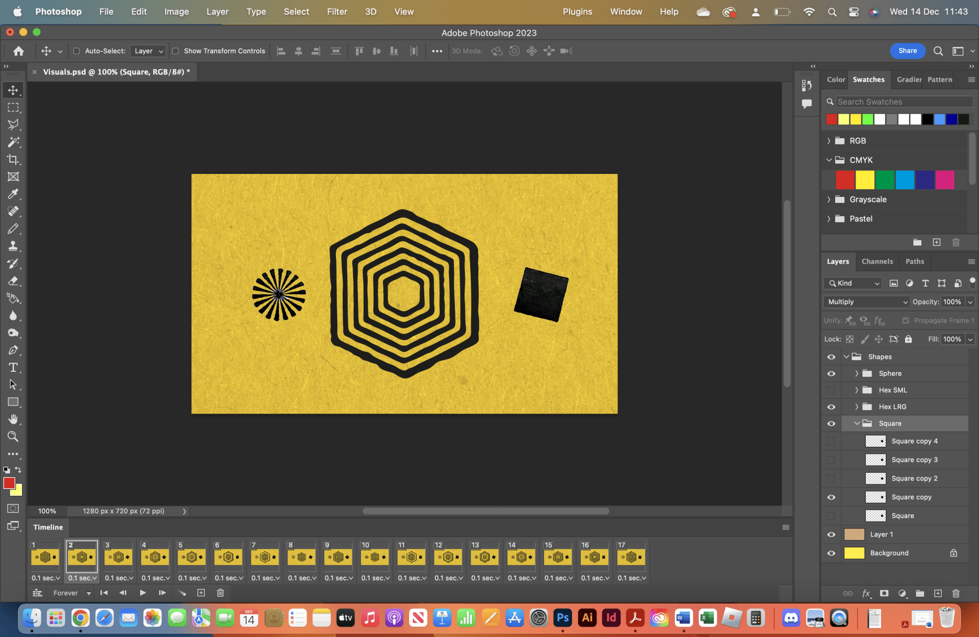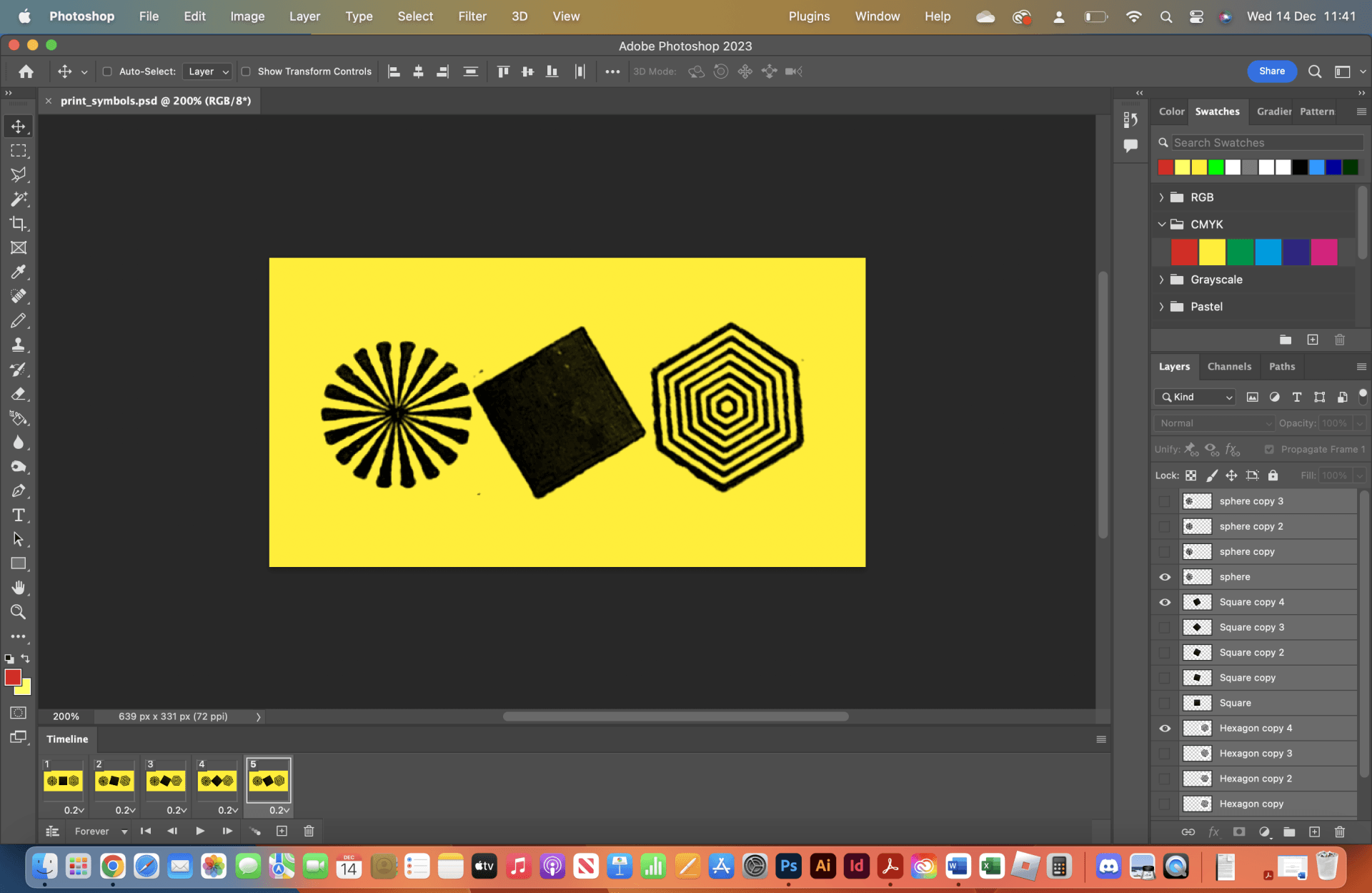 I collected the symbols from photographs and had a little experiment animating them in Adobe Photoshop, image 1. I then laid the symbols out in Adobe Illustrator to help my thought process and decide what I might do with them next. On rolling over the vectorised shapes with the select tool, the individual hexagons highlighted with a blue outline appeared to become animated, image 2-3. Lastly I imported the shapes into Adobe Photoshop once again to create a more trippy effect.