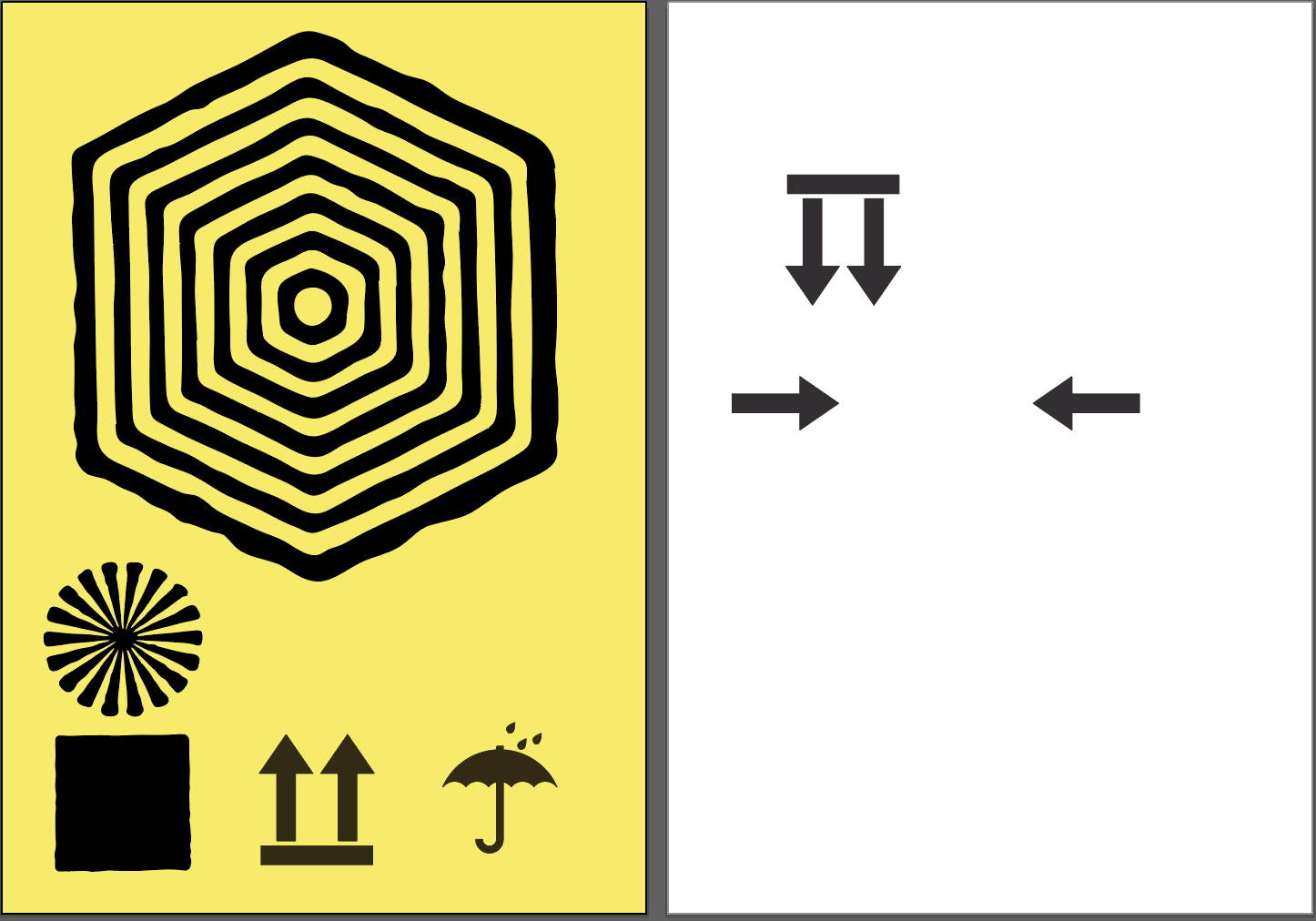By using a different medium to display the symbols, the meaning and message is instantly altered and disrupted. By enlarging the size of the hexagon shapes, this disrupts the origin further and becomes less recognisable from its intended purpose and context of packaging. It begins to take on new meaning and a new message.