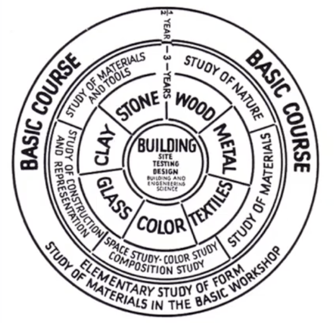 The outer ring indicates a preliminary 6-month course in basic materials and involved painting and rudimentary experiments in form-making. The inner two rings indicate a 3-year period where students were introduced to workshop training conducted by two masters: one artist, and one craftsman. The center of the wheel references building construction, engineering, and Architecture, which was studied in theory and then skills learned would put into practice by working on the actual constructions of buildings.