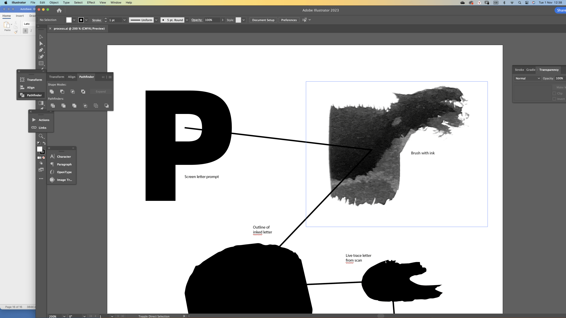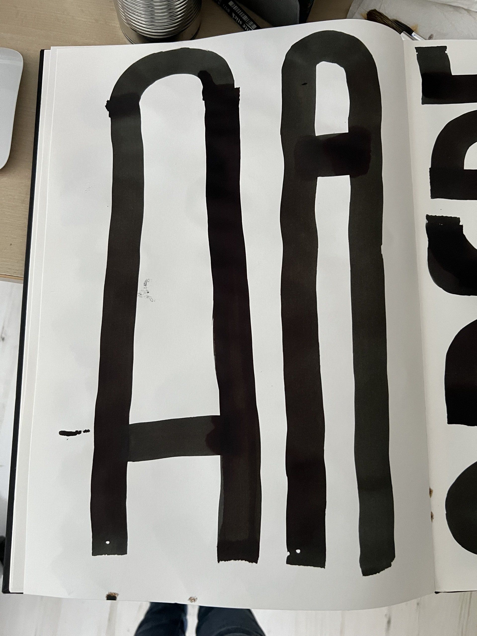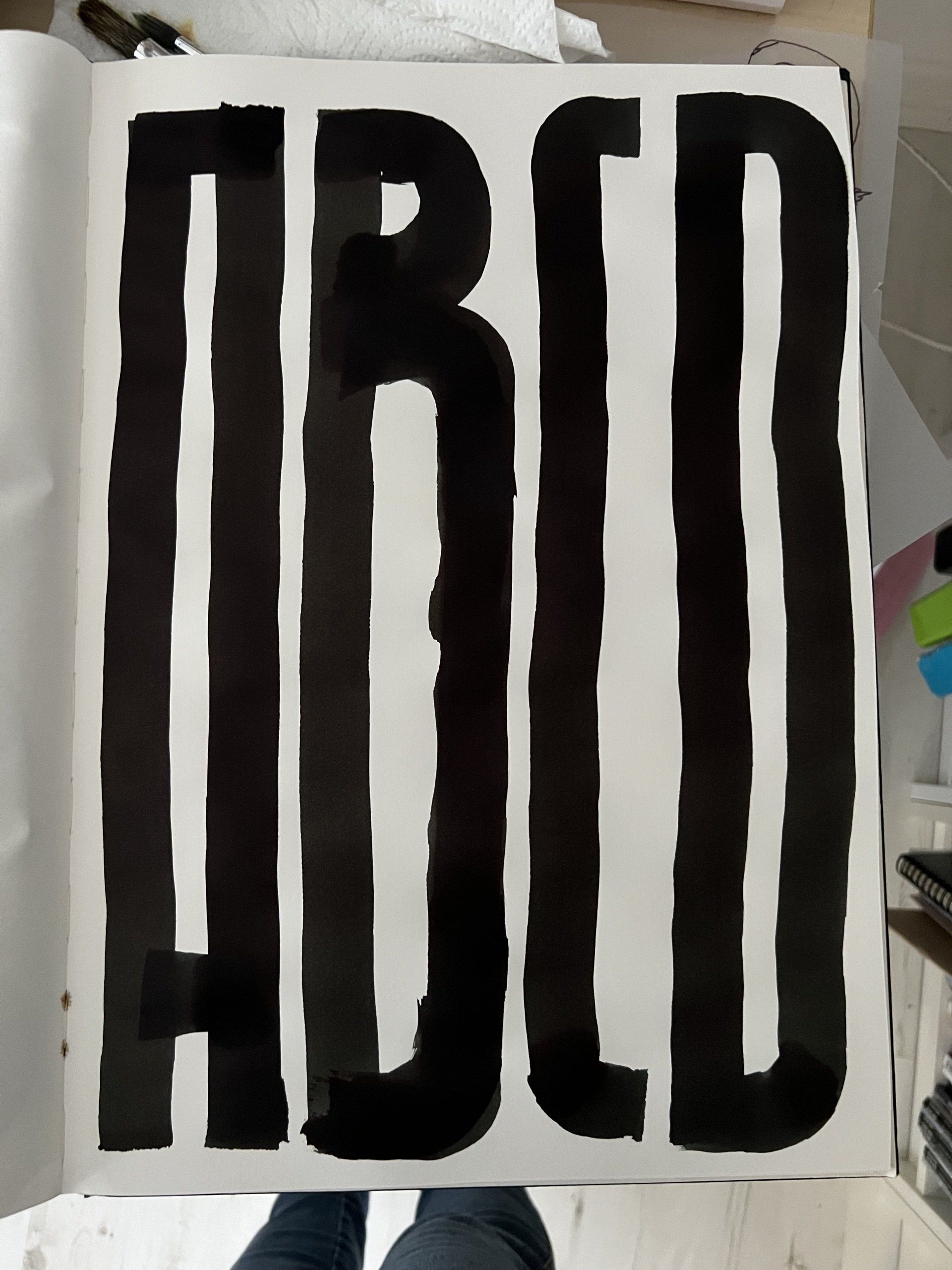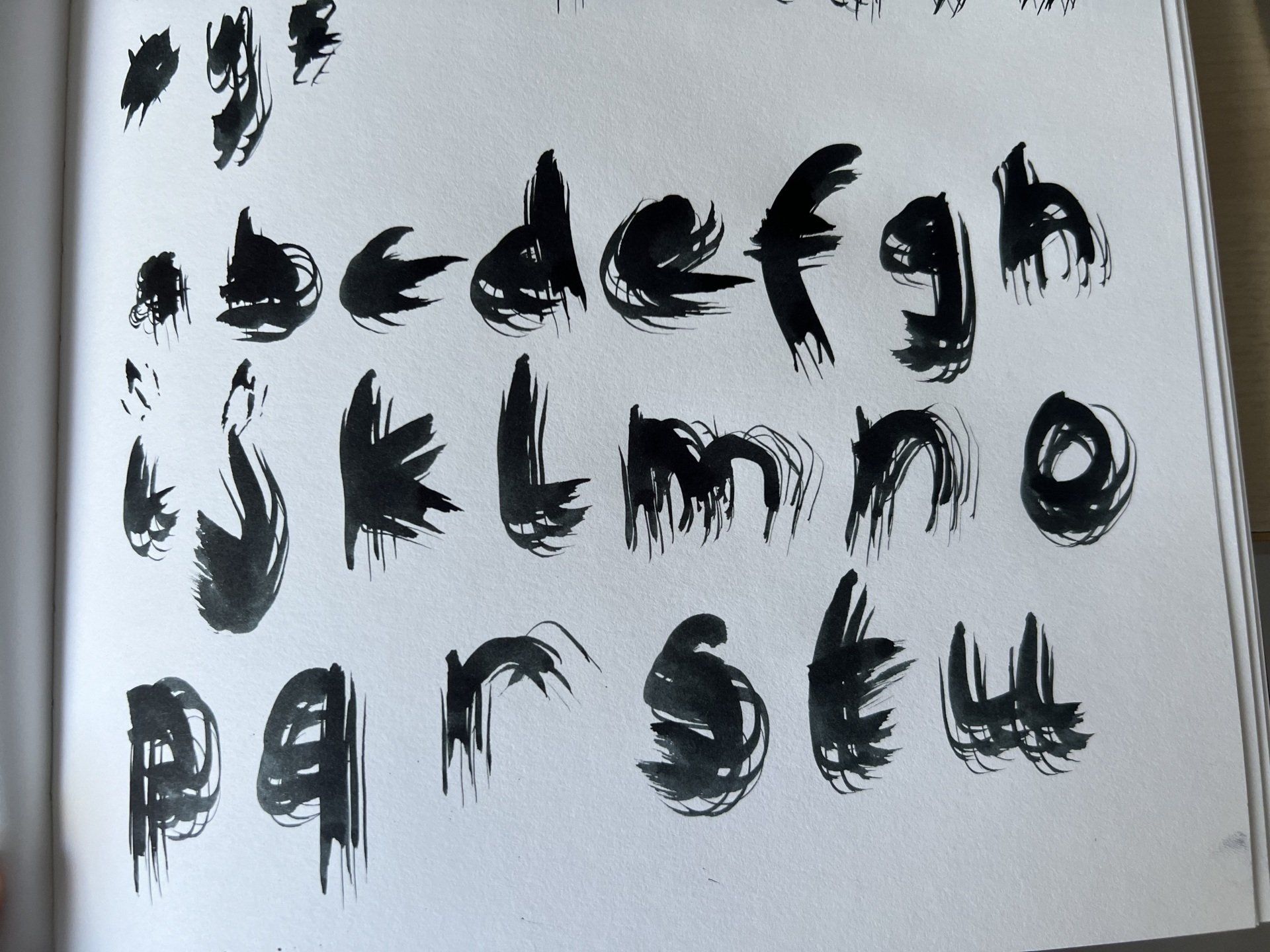 Using Chris Campe's creative process for her experimental lettering, I began by looking at a digital typeface onscreen for initial form while exploring the letterforms using analogue means including a variety of brushes, ink, fine liners and tracing paper before scanning and exploring digital techniques using Adobe Illustrator.
