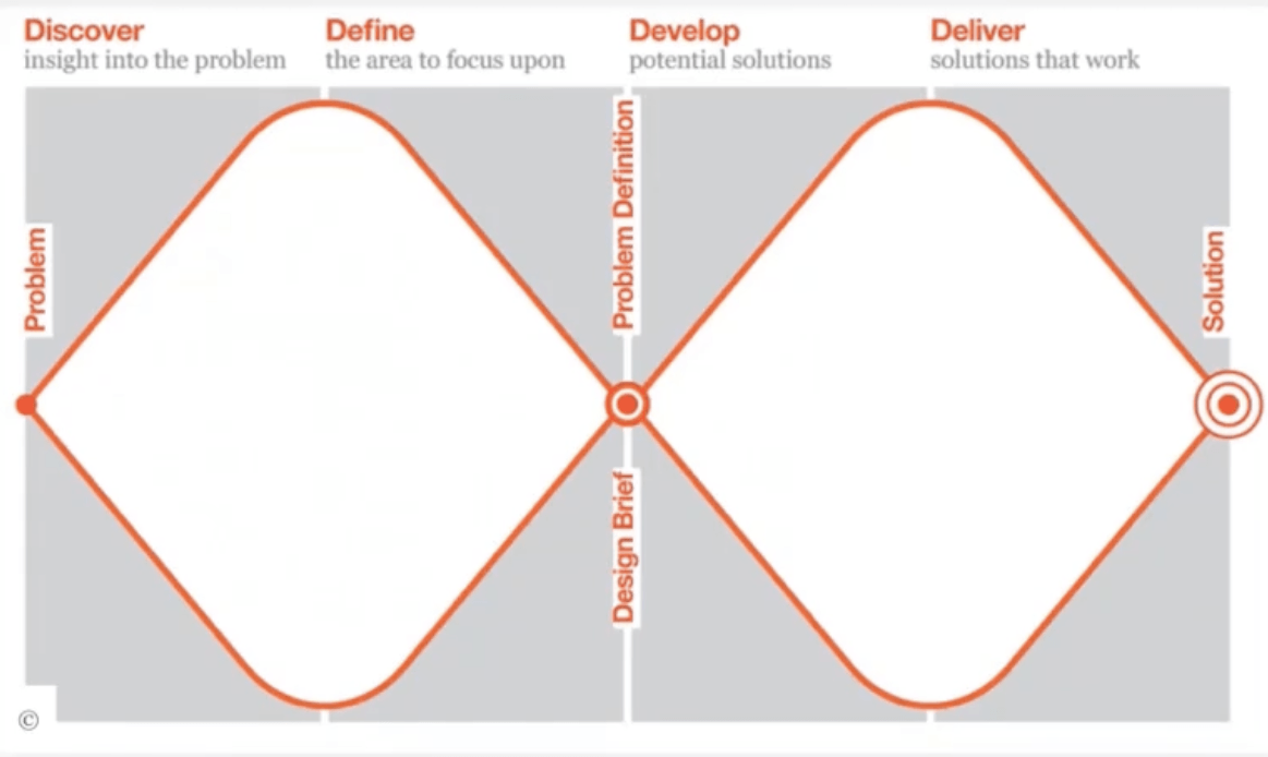 Simple graphical way to describe the design process and divided into 4 phases, discover, define, develop and deliver. Maps the divergent and convergent stages of the design process showing the different modes of thinking that designers use.