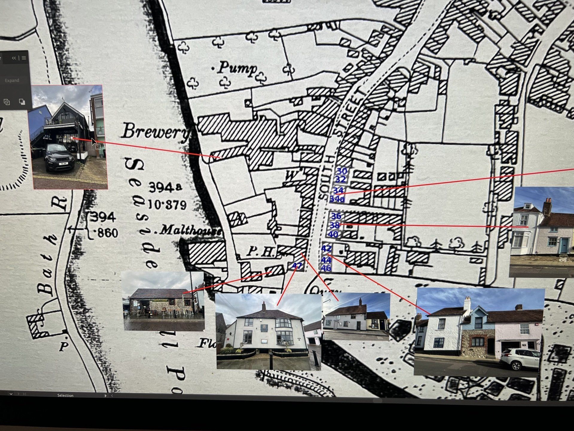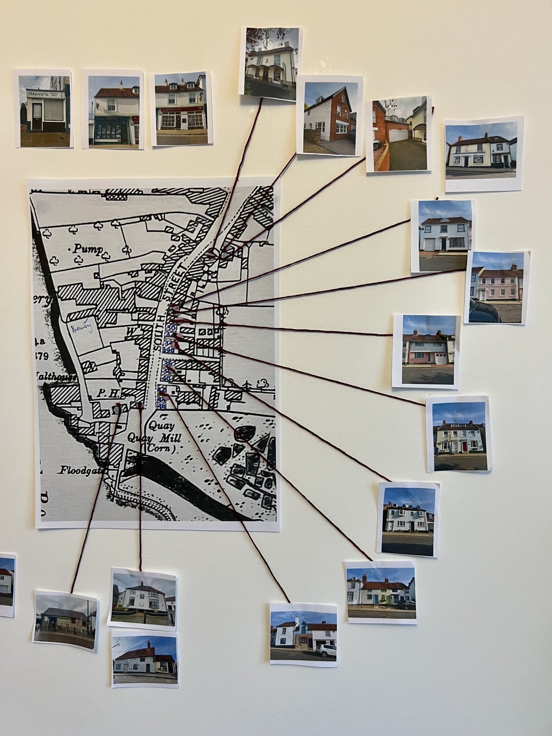 When I was playing detective with the buildings based on the old 1876 map, I chose to create it on my studio wall as a visual reference to see where I had got with the investigation (image 1). This made it so much clearer to track, so I could associate the buildings with the numbers and where they were, rather than the numbers alone. From this exercise I could see exactly what was missing now.