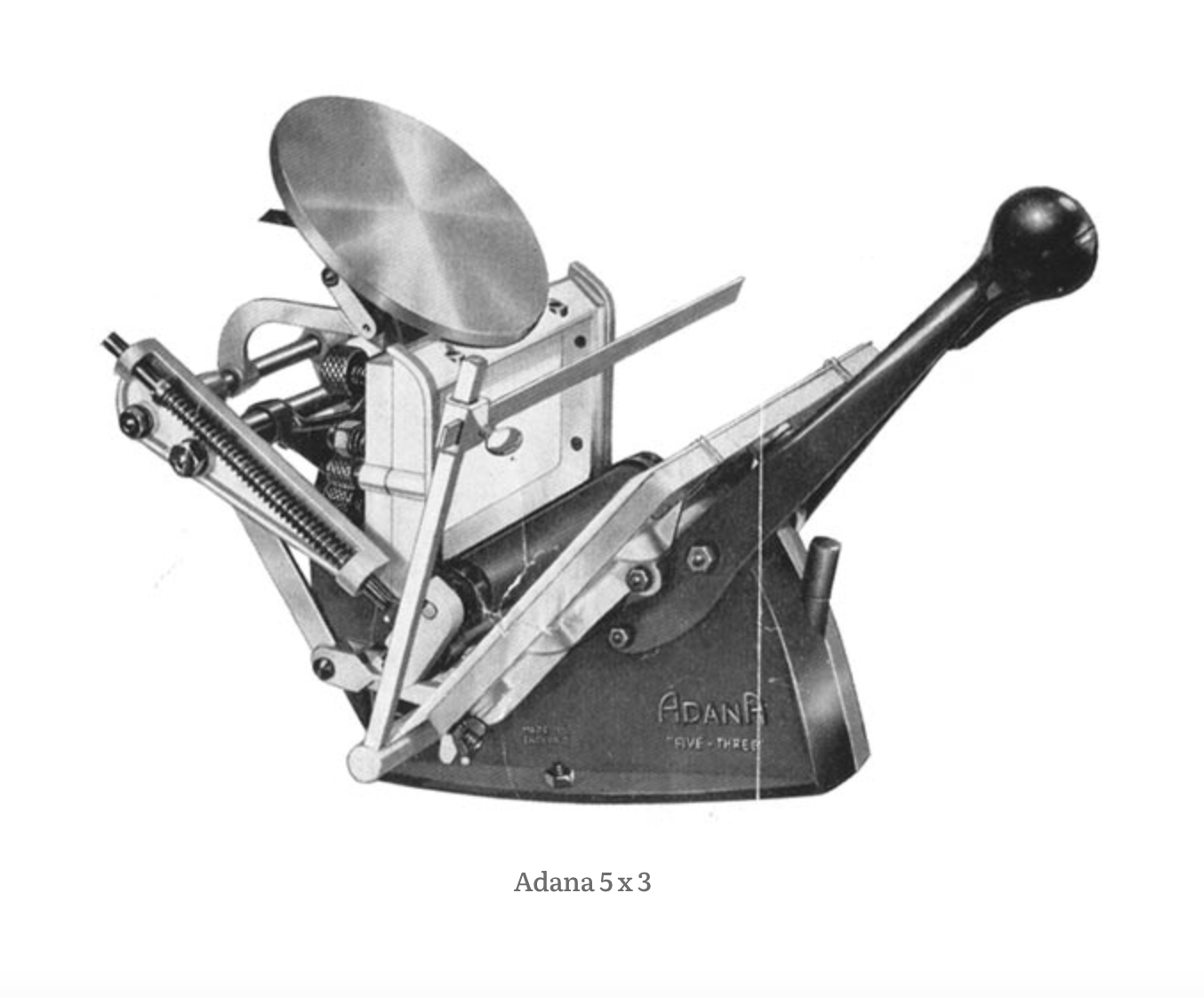 The Adana Agency was founded in 1922 by Donald Aspinall and selling their unique printing presses to both commercial companies and hobbyists around the world (Caslon Limited, 2022). The Adana 5x3 letterpress is the smallest of modern Adana machines and was first unveiled in 1956. It was one of the earliest Adana machines to be made of an aluminium alloy, rather than cast iron (Caslon Limited, 2022).