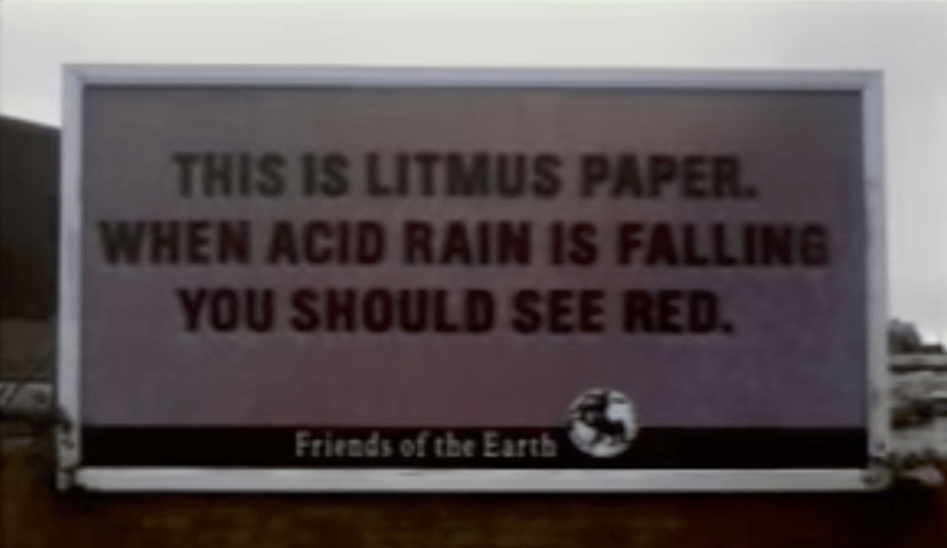 The first image is of a Friends of the Earth project, created in 1990. It is a cinema PIF, rated U, which makes its scientific point with creepy music. The billboard is made out of litmus paper and when acid rain falls, it starts to turn red, like blood. The blood represents the damage done to the environment, killing it and we should act now.