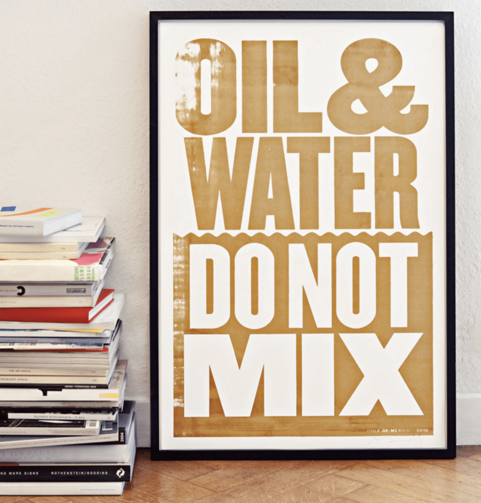This screen-printed poster was made with oil collected from the 2010 Gulf of Mexico disaster. Anthony Burrill designed the poster with one of his simple speciality phrases, hitting the message concisely. Proceeds from the sale of the print were donated to CRCL (Coalition to Restore Coastal Louisiana) a non-profit organisation dedicated to restoring the Gulf of Mexico’s coastal wetlands. The project was conceived and produced in collaboration with Happiness Brussels.
