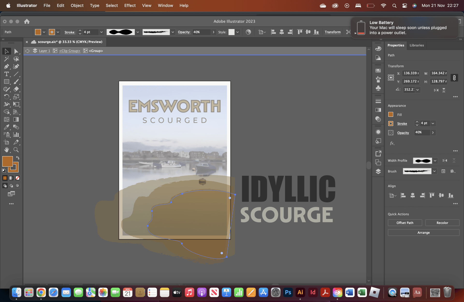 From here I wanted to represent the idea of sewage seeping into the local waters. In reality by the time it gets here the colour is diluted and not always as noticeable other than some scum on the surface, floating faeces, toilet paper and sanitary products. I wanted the unseen to be seen, so I created some vector shapes, adding different colours to each ring of scum and added a darker transparency, along with adjusting the shapes fill to a lower opacity.